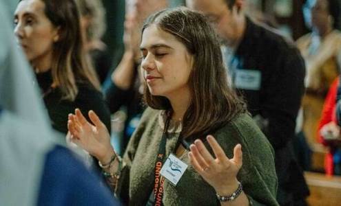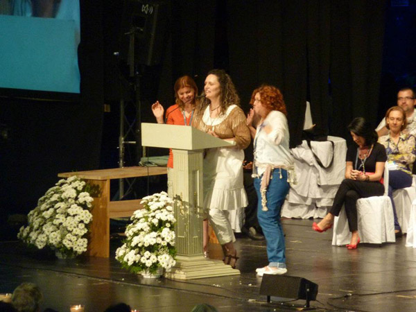 En un lateral del auditorio tres mujeres hacen oración de intercesión